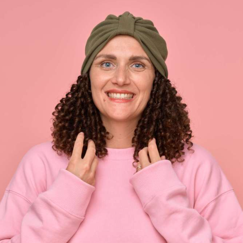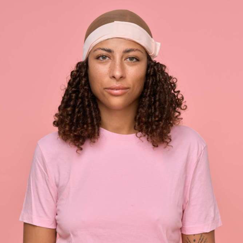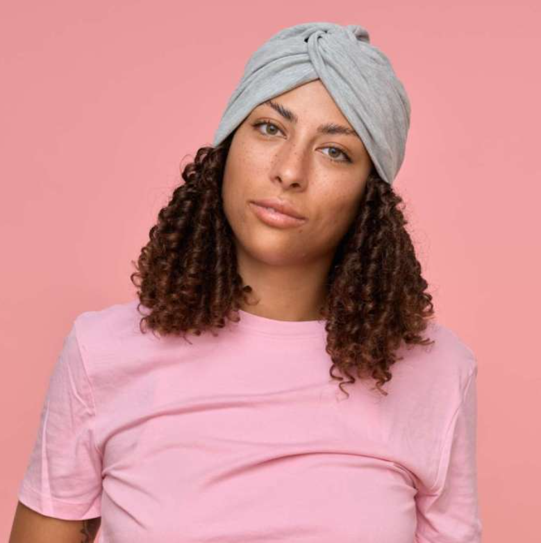 Régler le bandeau à votre tour de tête grâce au scratch à placer devant au-dessus du front. Placer ensuite le bonnet ou le turban de votre choix par dessus. Coiffer les cheveux de la couronne de cheveux plutôt vers l'avant.
