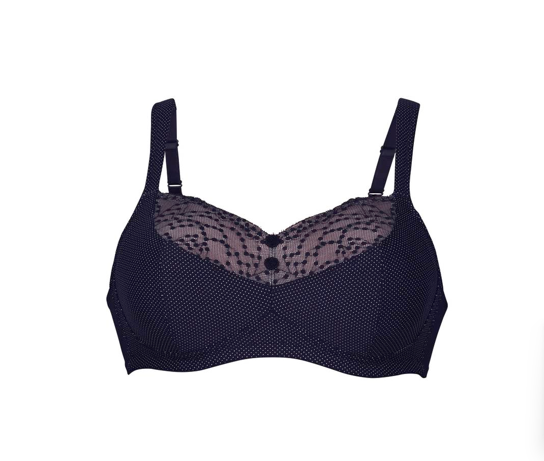 Motif à pois poétique à la française : Rehaussé de petits boutons décoratifs, le soutien-gorge spécial Orely avec ses poches pour prothèse affiche un imprimé à petits pois contrastant avec une broderie à pois espiègle. Le positionnement bas de la broderie à doublure opaque sur le décolleté crée l'illusion d'un séduisant balconnet. Des bretelles confort allègent grâce à un garnissage souple en mousse souple.