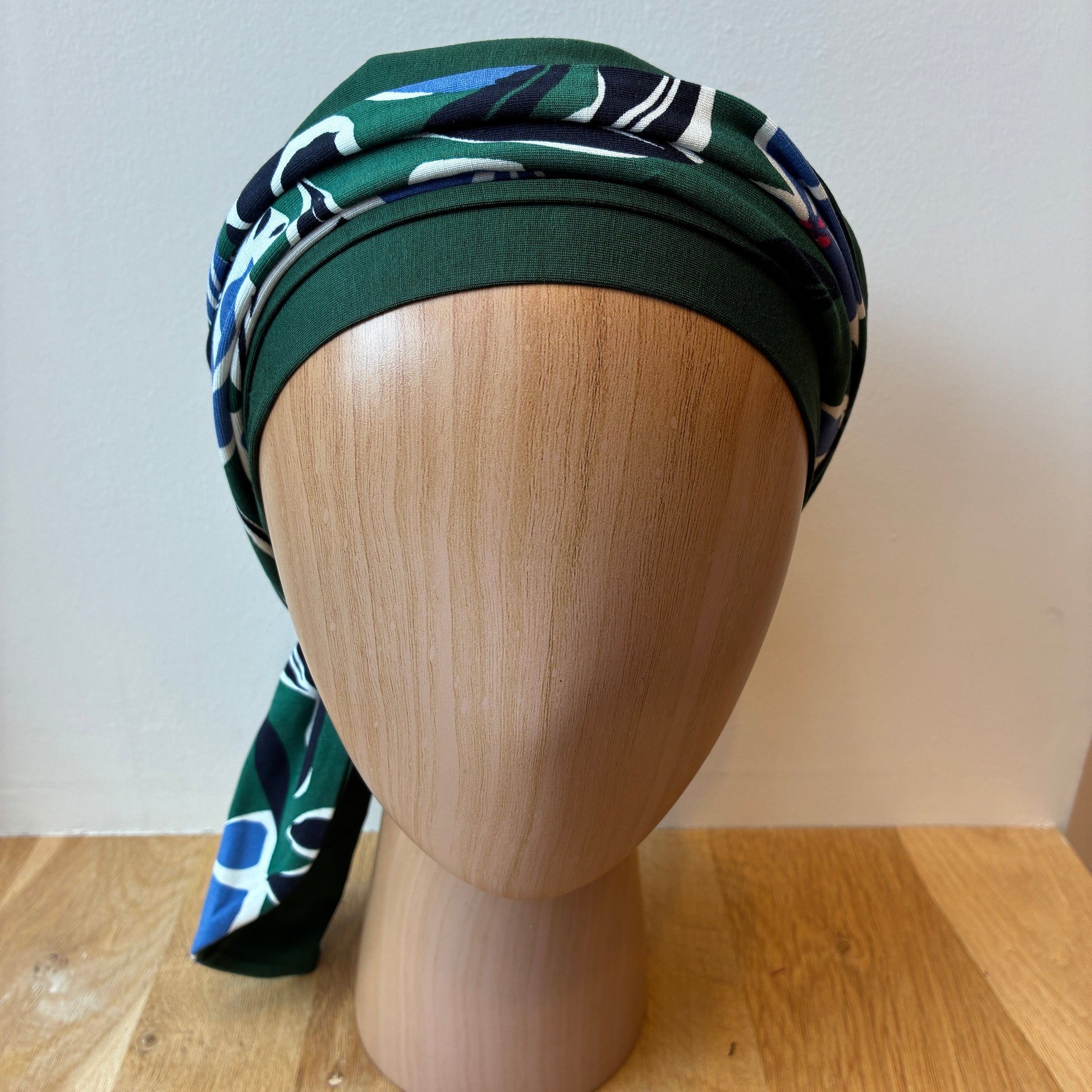 Nadia est un turban avec un bonnet préformé uni et un pan imprimé facile à nouer autour de la tête pour plus de volume.